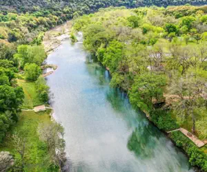 This quaint blue cottage on the Guadalupe River (no river view from cottage) between the 2nd and 3rd crossing on River Road in New Braunfels. The fenced lot is on approximately 2 acres with ample parking and filled with luscious pecan trees for plenty of shade. There is 145 feet of river front with decks, and a cement walkway for river access. House has private charcoal BBQ/picnic area right behind cottage under a huge pecan tree. Tube rental is just yards away! There are 3 houses on this property that share the river access, the Texas Star sleeps 14 and has river views. Right next to the Texas Star is the Wagon Wheel with river views and sleeps 14. If you have a large party, please inquire about the other 2 houses.