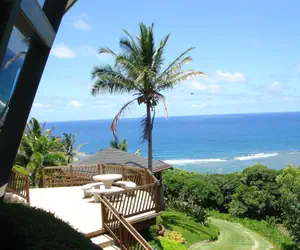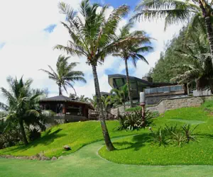 While all three bedrooms have king size beds and ocean views, the rest of the interior was planned with luxurious precision, with rich hardwood floors, abundant deck space, a grand entertainment room with home theater, unique features such as a dining gazebo. One of the master suites is a separate unit with king bed, 1/2 bath and outdoor private hot/cold shower, not connected to the main house but accessed via a walkway several steps away. The master suite in the main house has an attached den with a queen bed.