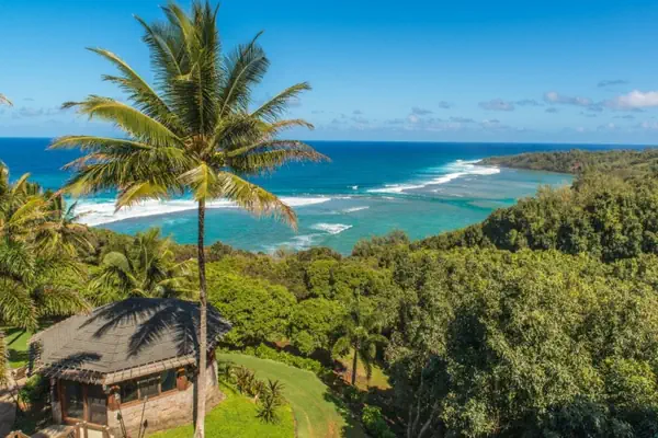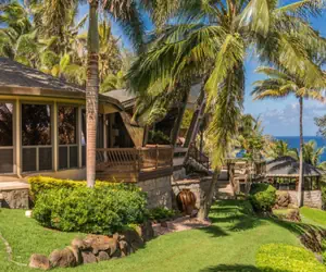 Perched cliffside on 10 acres above Pila'a Beach on Kauai's North Shore, this property offers numerous spots to take in the sprawling views of the crystal blue Pacific to the east and verdant mountains to the west. As well, a ten minute nature walk with incline on the way back leads to a remote and idyllic beach below.