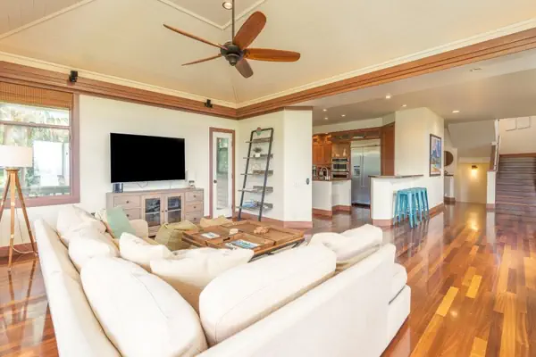 The grand master suite is located in the main house nestled among the trees with an expansive, romantic lanai, en-suite bath, sitting area, TV and lovely ocean views. The lower level boasts a spacious living room with a media center. Large glass doors open up to a welcoming lanai for friends and family to gather for festive barbecues, or relaxing with a tropical cocktail.