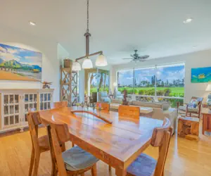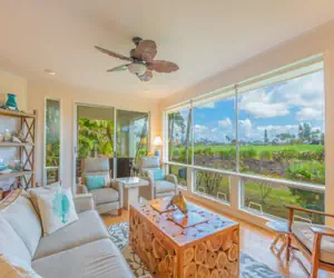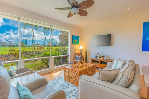 The large great room concept, with expansive picture windows and comfortable furniture, allows you to gaze over tropical Hawaiian foliage and the golf course. Accessible from the great room and bedroom suite, the lovely covered lanai, complete with comfy lounge chairs and a dining table, is perfect for morning coffee, leisurely afternoons, or evening cocktails while enjoying the cooling trade winds. A short stroll to the north end of the property offers unlimited views of the ocean, mountains, and breathtaking sunrises and sunsets.