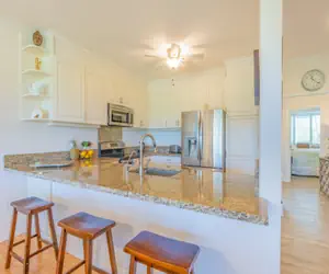 The modern chef’s kitchen is fully stocked with a variety of cookware and appliances, offers a bright vibe, and makes you feel right at home. With granite counters and ample storage, the family chef may well feel inspired to prepare either old favorites or a new Hawaiian recipe for all to enjoy. A dining table for 6 and bar stools at the counter provide a comfortable area for enjoying your meals.