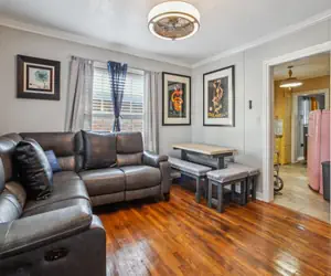 The master bedroom features a canopy king bed to take you back in time, the second bedroom has a wrought-iron queen bed frame, the third bedroom has two twin beds, and the fourth bedroom has a daybed with a trundle bed below allowing for up to eight guests. The retro stove and fridge will help make the meals you create at our house memorable, while the dining area has plenty of room for you and your friends.