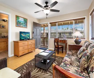 The Kona Shores condominium complex has an ocean-front pool with a cabana, two bathrooms and a charcoal grill for barbecuing.