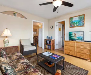 There is plenty of seating in the living area, a flat screen TV with cable, complimentary Wi-Fi, plus a screened in lanai with outdoor seating.