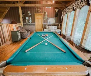 Unwind and have fun in the game room situated in the loft, where adventure and relaxation await! This cozy space is designed for entertainment, with a pool table for friendly family competitions or casual games with friends. A comfy chair provides the perfect spot to sit back and take a break, and a twin sleeper provides cozy sitting space and twin sleeping space at bedtime. At the same time, a twin-over-twin day bed offers extra cozy seating for a comfortable night's sleep or a comfy place to curl up with a good book or nap. This room is tastefully decorated with warm lighting and comfortable decor, making it the perfect retreat from the hustle and bustle of everyday life. Whether you're looking to relax, play a game of billiards, or get some shut-eye, the game room is the ultimate spot to unwind and have fun.